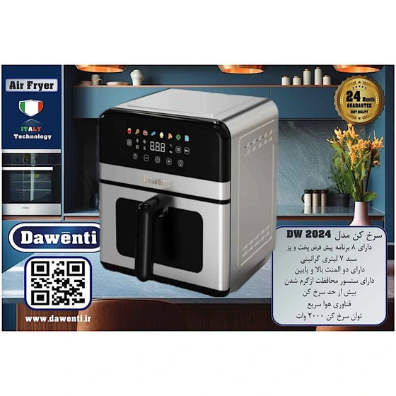 سرخ کن هواپز داونتی مدل DW2024 دارای 2 المنت بالا و پایین توان 2000 وات سبد گرانیتی با ظرفیت 7 لیتر دارای 10 برنامهی پخت و پز پیش فرض