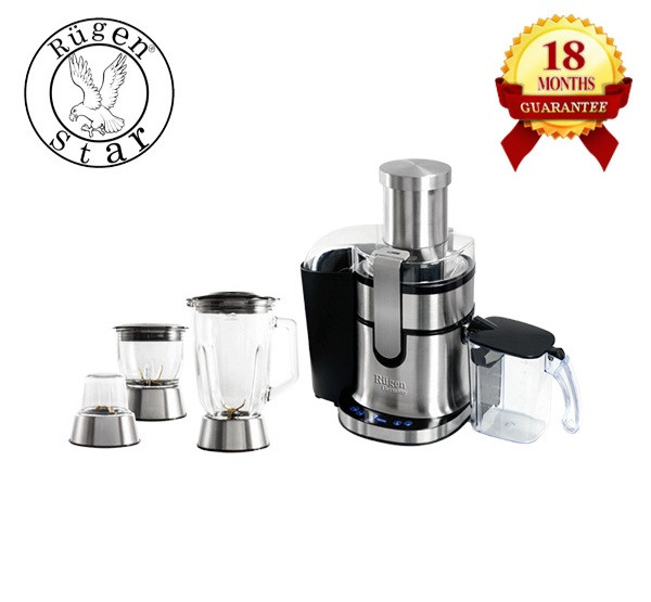 آبمیوه گیر 4 کاره روگن مدل RU-1210 محصول زیبای این شرکت می باشد. موتور قدرتمند 1200 وات دستگاهی عالی برای تمام مصارف خانگی است. بدنه اصلی آب میوه گیری که علاوه بر آبمیوه گیری به عنوان خردکن، همزن و آسیاب استفاده می شود. جنس بدنه آب میوه گیری ترکیبی از پلاستیک و استیل می باشد که علاوه بر ظاهری که دارد باعث تمیزی آسان بدنه می شود. همچنین پارچه مخصوصی که بدنه آن از پلاستیک مرغوب و محکم ساخته شده است، خروجی آن به آبمیوه گیری متصل می شود. فیلتر دستگاه از فولاد مقاوم ساخته شده است که در اثر استفاده طولانی مدت زنگ نمی زند و فرسوده نمی شود. این فیلتر به راحتی جدا می شود و می توان آن را در داخل ماشین ظرفشویی قرار داد. روی بدنه آبمیوه گیری صفحه نمایشی با دکمه های لمسی برای روشن و خاموش شدن و تنظیم سرعت در 5 حالت با عملکرد توربو تعبیه شده است، همچنین کار با صفحه نمایش دیجیتال تمام لمسی بسیار راحت و لذت بخش است. پایه های ضد لغزش نیز به سطوح مختلف می چسبند و از حرکات اضافی دستگاه جلوگیری می کنند. محفظه های خردکن و آسیاب شیشه ای با تیغه های فولادی که کارایی بالایی دارند. پایه میکسر پلاستیکی و دارای ظرفیت 1.5 لیتر می باشد که به راحتی روی پایه اصلی نصب می شود. دستگاه روگن مجهز به مخزن بزرگ تفاله می باشد که با درپوشی که به بدنه بسته شده روی مخزن قرار می گیرد که از پاشش خمیر به محیط جلوگیری می کند.