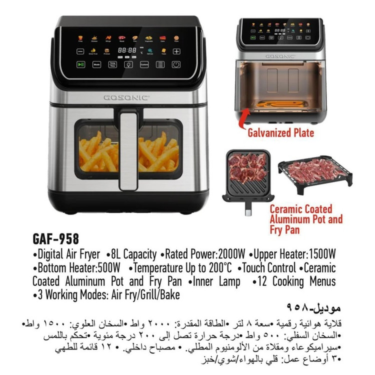 سرخکن بدون روغن گوسونیک مدل GAF-958 مجهز به صفحه نمایش لمسی دیجیتال و پنجره شفاف دید برای مشاهده مراحل پخت است. این پنجره امکان بررسی وضعیت غذا بدون باز کردن درب دستگاه را فراهم میکند و کمک میکند تا غذا بدون نیاز به توقف و باز کردن درب، کنترل شود. همچنین سیستم قطع خودکار، ایمنی بیشتری را برای کاربران فراهم میکند، و چراغ داخلی دستگاه نیز باعث میشود که دید بهتری از داخل دستگاه داشته باشید.